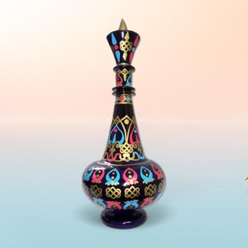 - تصميم مصنوع يدويًا: زجاجة من الزجاج باللون الأزرق مطلية يدويًا بشكل رائع تتميز بنقشات شرق أوسطية معقدة مع لمسات ذهبية وتفاصيل باللون التركواز.