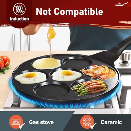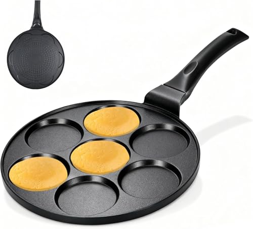 LUCKY - طاسة بان كيك غير لاصقة مكونة من 7 قوالب مقاس 24.6 سم، ماكينة صنع البان كيك الصغيرة مع طلاء خالٍ من حمض بيرفلورو الأوكتانويك، شواية كريب للأطفال، شواية إفطار متوافقة مع الغاز، أسود من لاكي