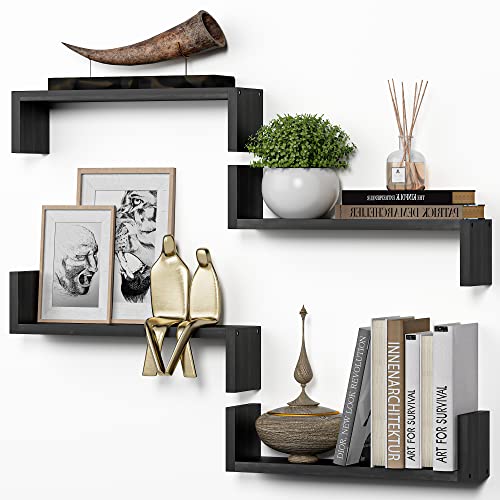 LUDORU - ارفف خشبية عائمة تثبت على الحائط من امادا هاوس فيرنيشينج مجموعة 4 قطع رفوف بتصميم ريفي اسود للتخزين حائط سهلة التركيب فريد لديكور صنوبر