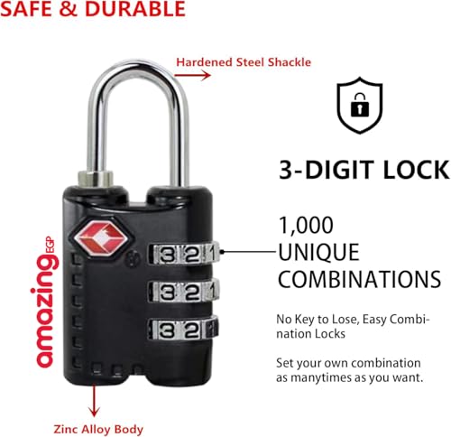 THE PACK - اقفال امتعة معتمدة من ادارة امن المواصلات الامريكية اميزينج اي بي جي، اقفال تي اس ايه مكونة من 3 ارقام للامتعة والخزانة وشنطة الظهر وشنطة المدرسة وشنطة السفر - محمولة ومقاومة للصدا وقفل امان (2، اسود