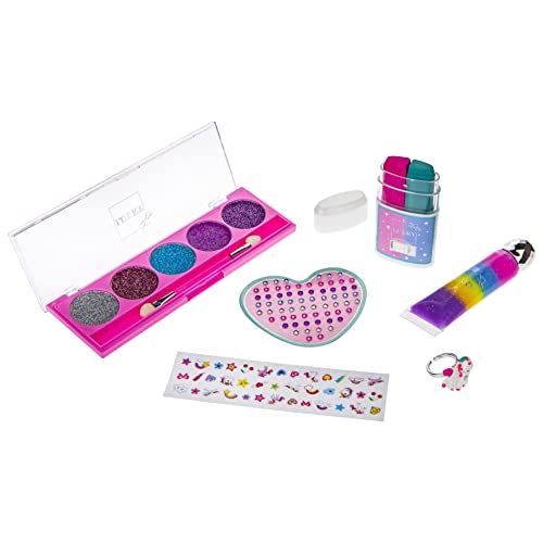 - الشعر والماكياج. ايشادو لامع. ترتر وملصقات للأظافر. بودرة شعر. نكهة الفراولة (ملمع الشفاه). خاتم "يونيكورن". صالح: 36 شهر 10 ملليتر (ملمع شفاه) 2*3.5 جرام (مسحوق الشعر) 5 جرام (ظلال العيون).