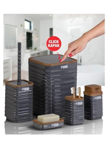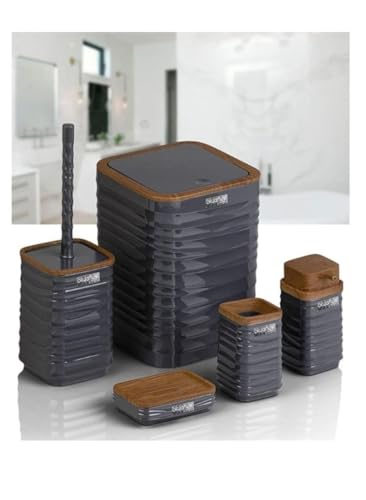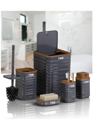 generic - طقم حمام مربع مكون من 5 قطع من لونا، طبق صابون وموزع صابون وسلة مهملات وفرشاة مرحاض وحامل فرشاة اسنان وغطاء خشبي - رمادي