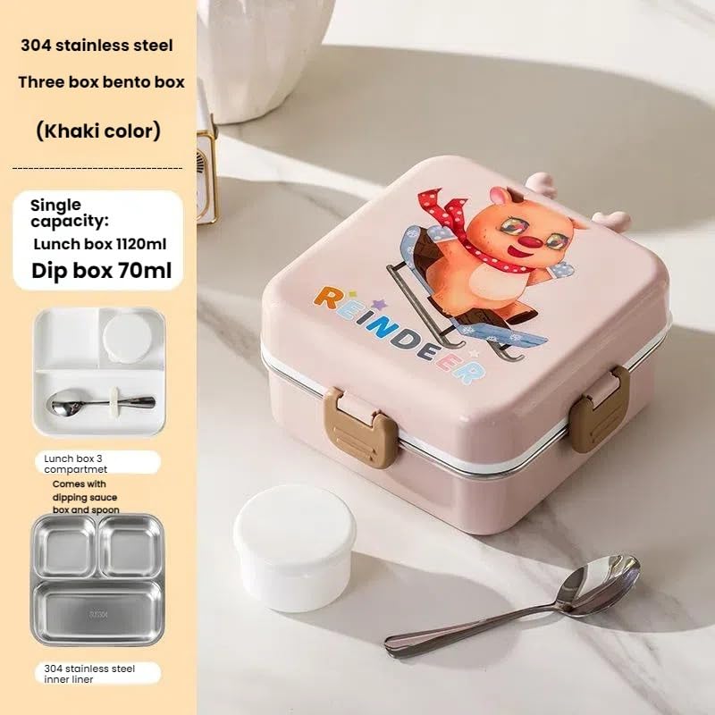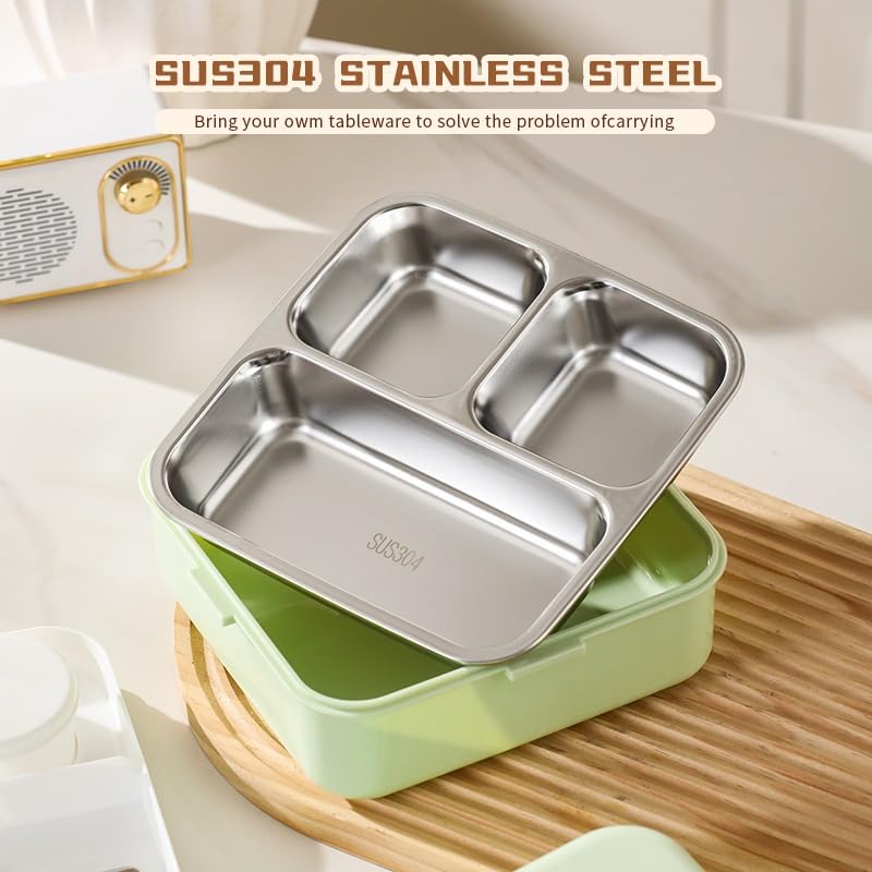 Generic - لانش بوكس معزول من الستانلس ستيل بـ 3 أقسام مع علبة للصلصة وملعقة، قابل للاستخدام في الميكروويف ومقاوم للتسرب، علبة حفظ طعام 1120+70 مل، محمولة للطلاب والأطفال والنزهات والمدرسة (أخضر)