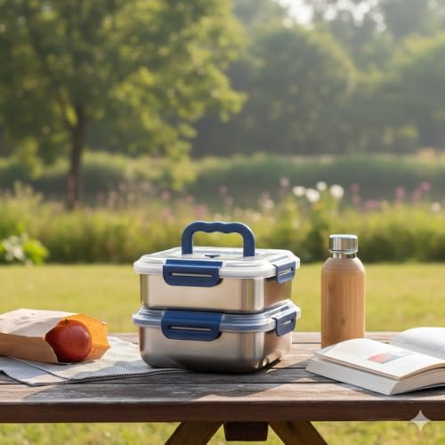 Generic - حافظة طعام معدنية محكمة الغلق من الستانلس ستيل مانعة للتسرب من طبقتين بتصميم قابل للتكديس مع مقبض حمل للعمل والمدرسة
