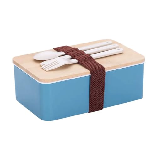 Generic - صندوق غداء، غطاء خشبي، حافة قابلة للازالة، حاوية طعام محكمة الغلق مانعة للتسرب، صندوق غداء بينتو مع ادوات مائدة (ازرق)
