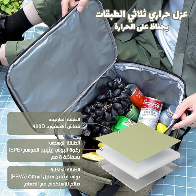 - سعة كبيرة 25 لتر للوجبات الحقيقية: مساحة داخلية واسعة تناسب العديد من الحاويات والوجبات الخفيفة والمشروبات لإعداد الوجبات أو النوبات الطويلة أو النزهات العائلية