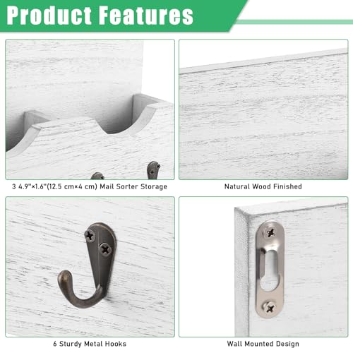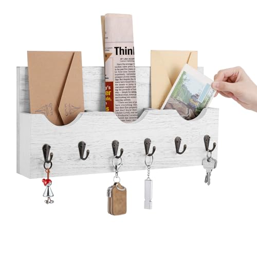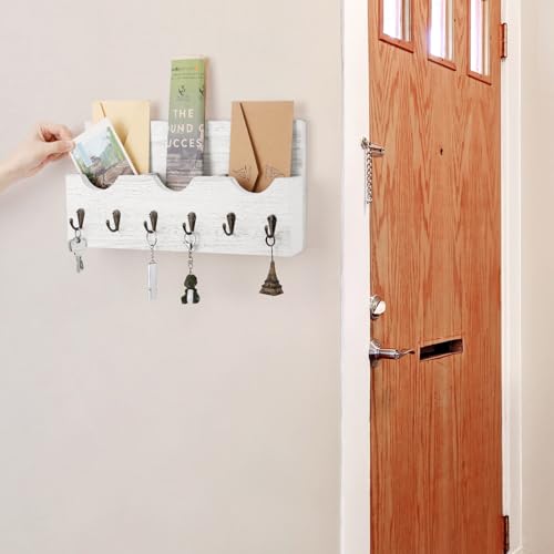 Luplom - منظم حامل بريد بنمط ريفي من لوبلوم مع 6 خطافات مفاتيح خشبية لتنظيم المفاتيح وحامل الحائط للمدخل 3 مساحات تخزين بلون ابيض خشب معدني