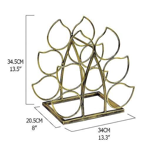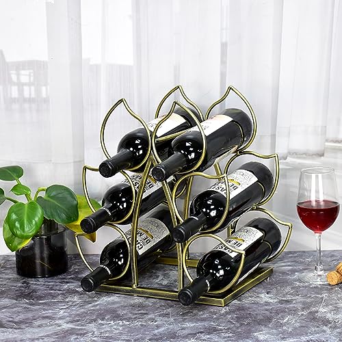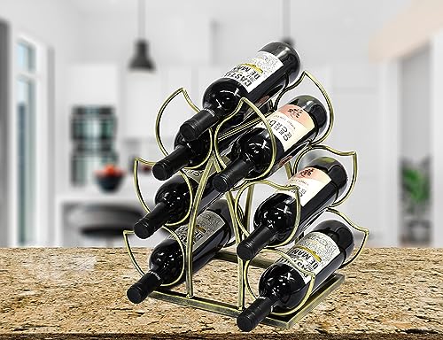 LushAccents - رف زجاجات عصير يوضع على سطح الطاولة - يتسع لـ 7 رف زجاجات قائم بذاته عصري معدني ذهبي صغير - حامل زجاجات عصير من 3 طبقات لسطح الطاولة ومخزن المؤن ولتخزين زجاجات العصير