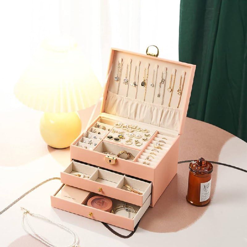 - منظم مجوهرات فاخر مصمم بـ 4 أدوار مستقلة، حيث يوفر كل دور مساحة مخصصة لنوع معين من الحلي لضمان الترتيب التام.