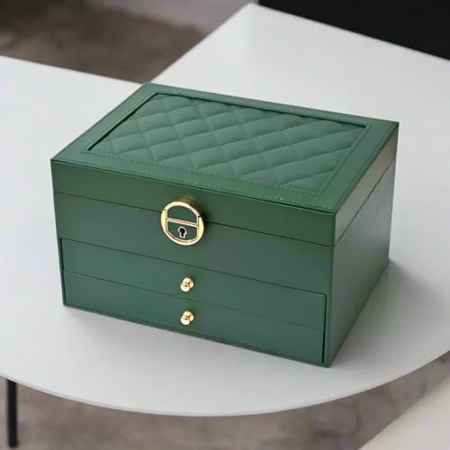 Generic - صندوق مجوهرات فاخر 4 طبقات، جلد صناعي مع بطانة قطيفة، منظم للذهب والساعات والاكسسوارات، تصميم متعدد الأدراج مع قفل محكم (زيتي)