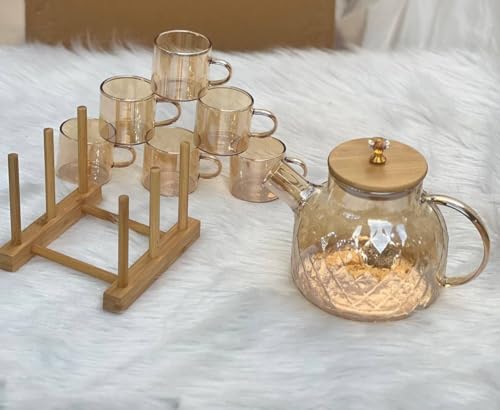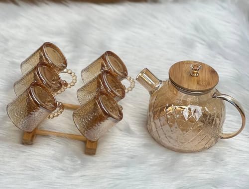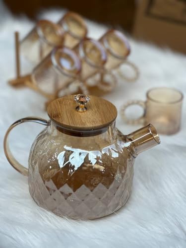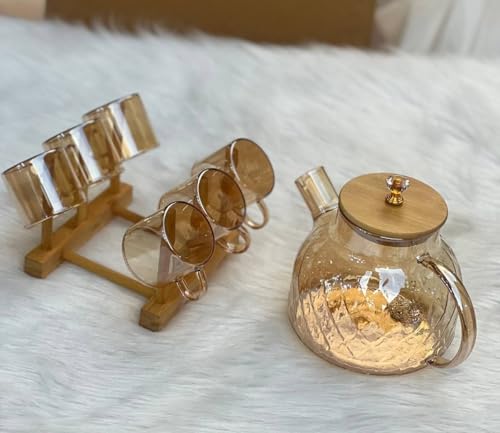 Generic - Luxury Amber Glass Teapot Set with 6 Cups & Wooden Stand - Elegant Diamond Pattern Tea Maker with Bamboo Lid & Crystal Knob - Heat-Resistant Glass Beverage Set for Home & Hosting (Amber Gold)