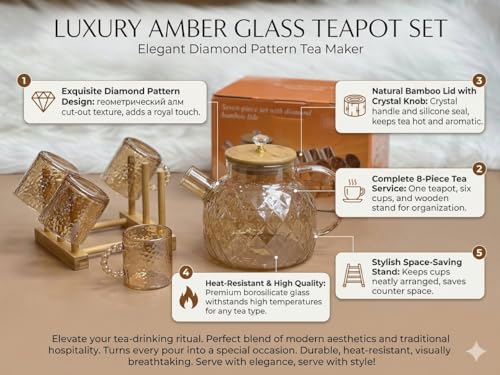 - 2️⃣ ☕ Complete 8-Piece Tea Service: Includes one large amber teapot, six matching diamond-pattern cups, and a high-quality wooden stand for organized storage and elegant display.
