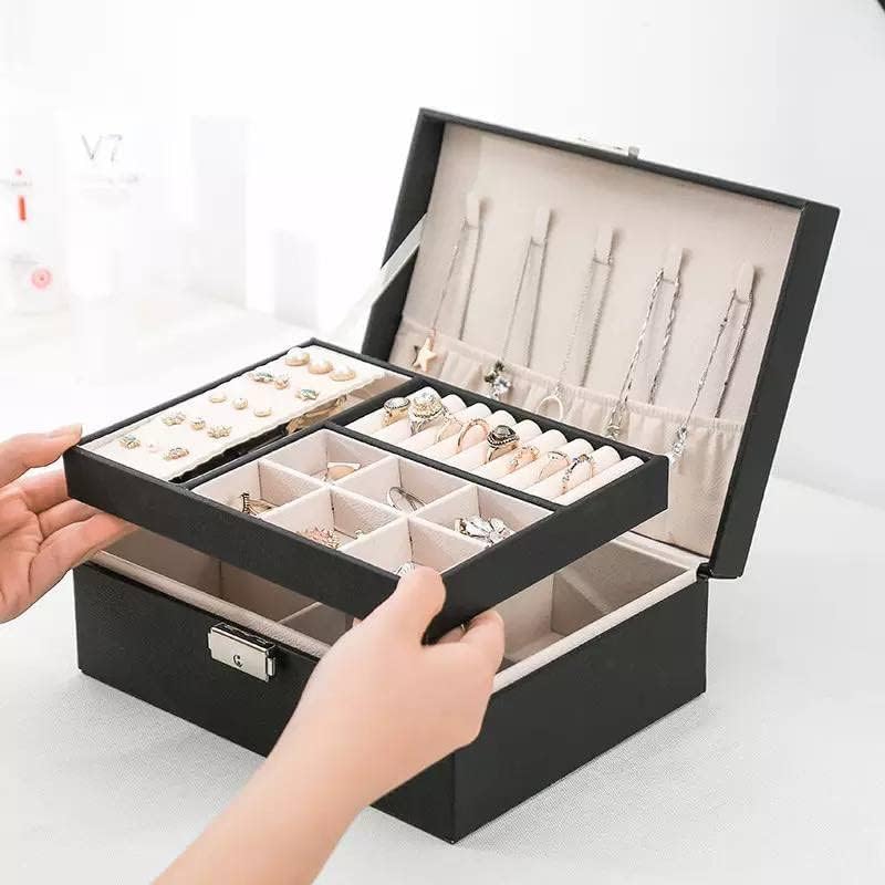 - 【تنظيم مزدوج الطبقات】يتميز هذا المنظم بمستويين واسعين، مما يسمح بالترتيب المنهجي لمجوهراتك، وفصل السلاسل والأساور والخواتم والأقراط إلى مقصورات مخصصة، مما يمنع التشابك والتلف، مع جعل الاسترجاع سهلاً ويحافظ على عرض نظيف ومرتب، مثالي للاستخدام اليومي أو السفر أو كهدية لأي شخص يقدر الفخامة المنظمة.