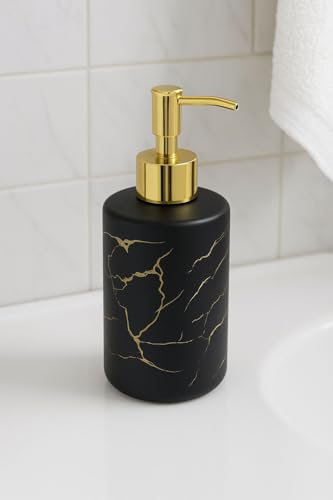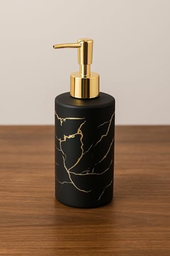 - تصميم فاخر: موزع صابون أنيق من السيراميك الأسود يتميز بنقشة رخامية ذهبية فاخرة وآلية ضخ بلمسة نهائية ذهبية لإضفاء جمالية راقية على حمامك.