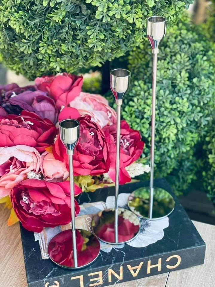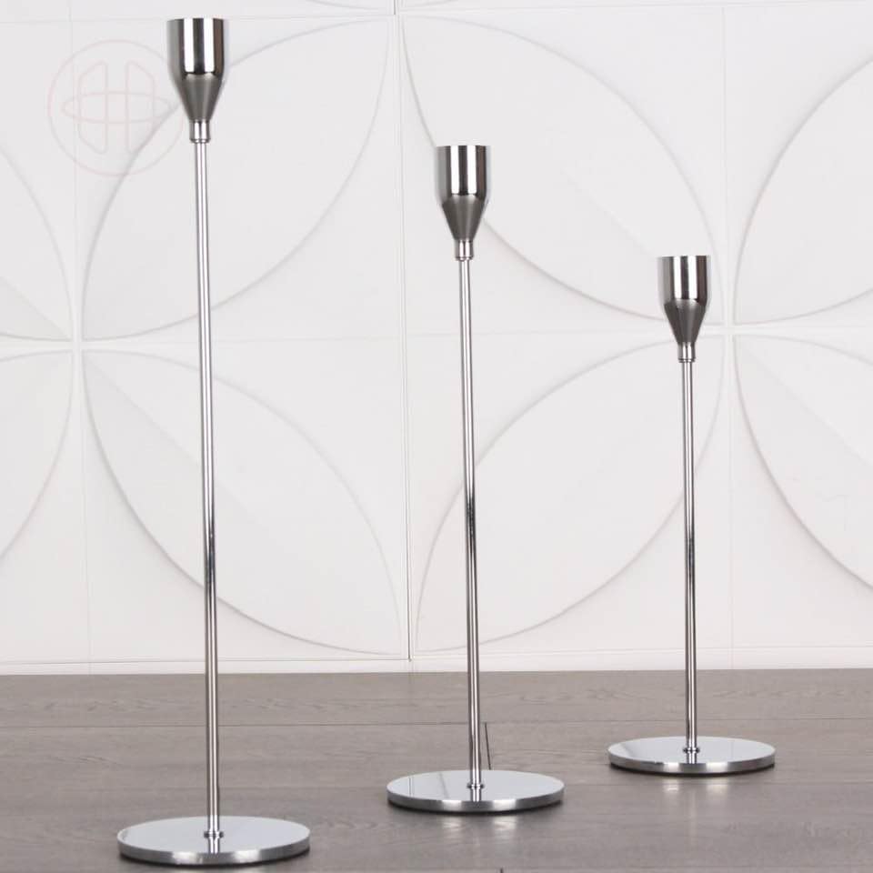 - ١) تصميم فاخر: حامل شموع ثلاثي المستويات مصنوع من المعدن الفضي اللامع مع قاعدة ثابتة أنيقة