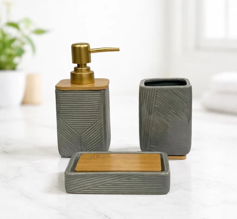 - طقم إكسسوارات حمام فاخر من السيراميك - 3 قطع، لون رمادي عاجي مع مضخة ذهبية غير لامعة وغطاء من الخيزران