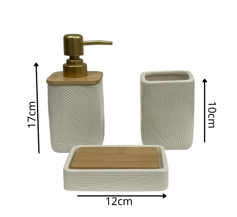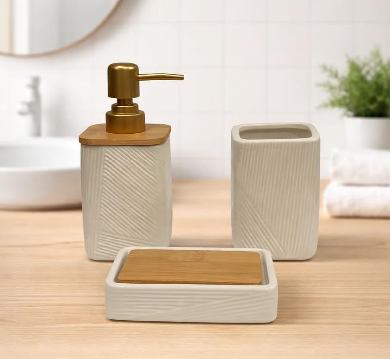- طقم إكسسوارات حمام فاخر من السيراميك - 3 قطع، لون أبيض عاجي مع مضخة ذهبية غير لامعة وغطاء من الخيزران