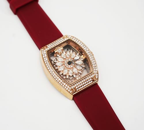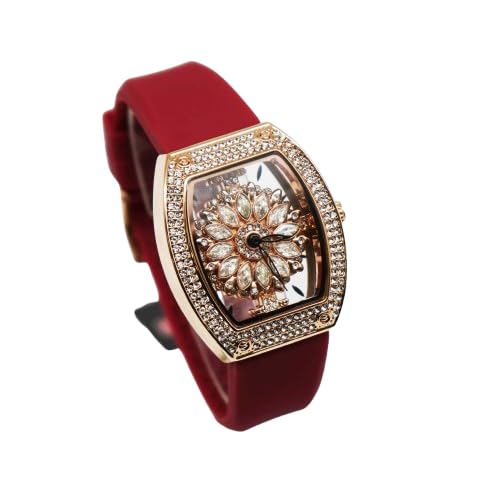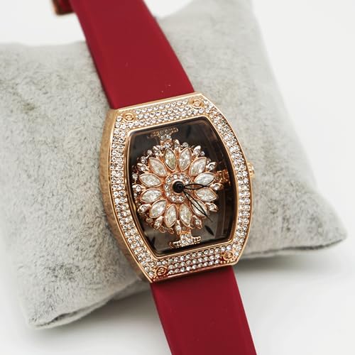 Generic - ساعة فاخرة بتصميم زهور كريستالية للنساء، هيكل ذهبي وردي وسوار من السيليكون بلون بورغندي