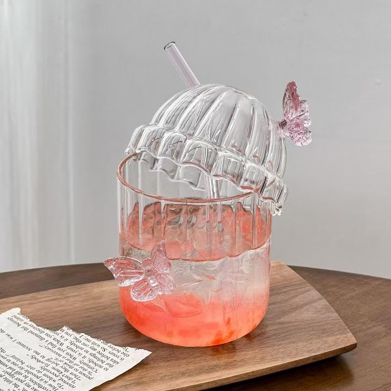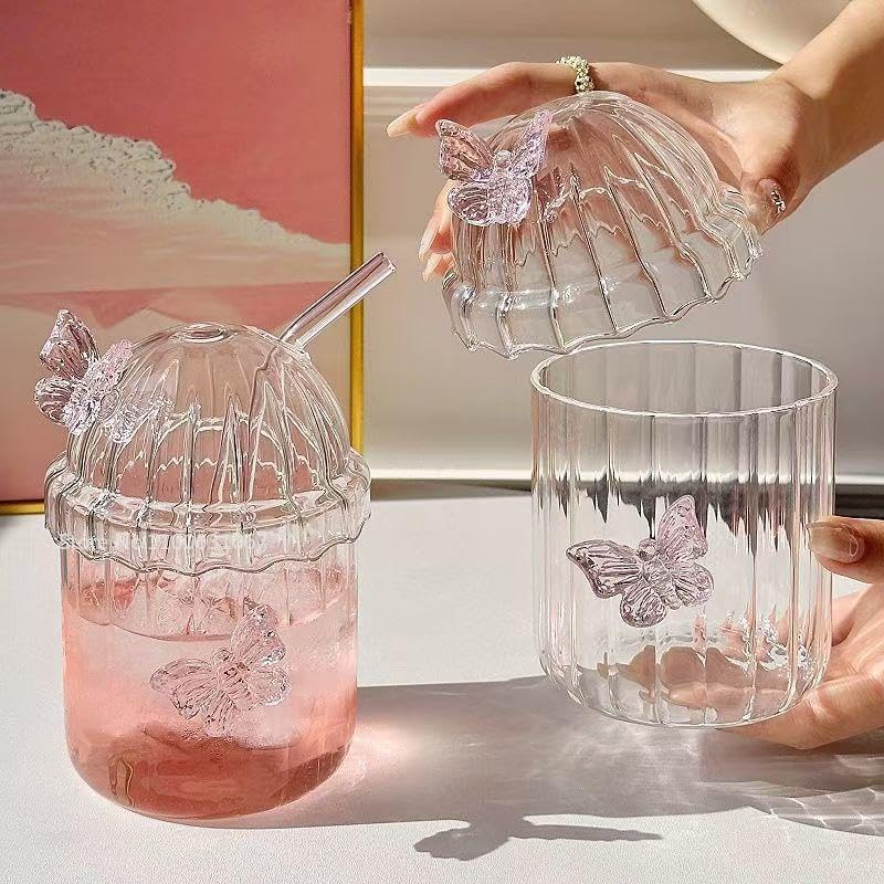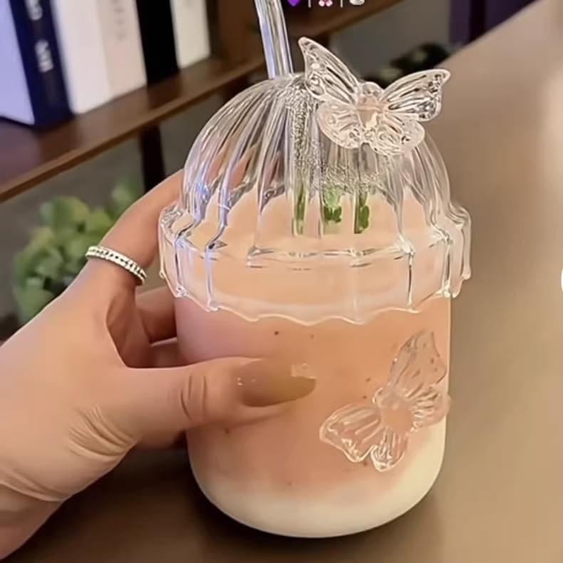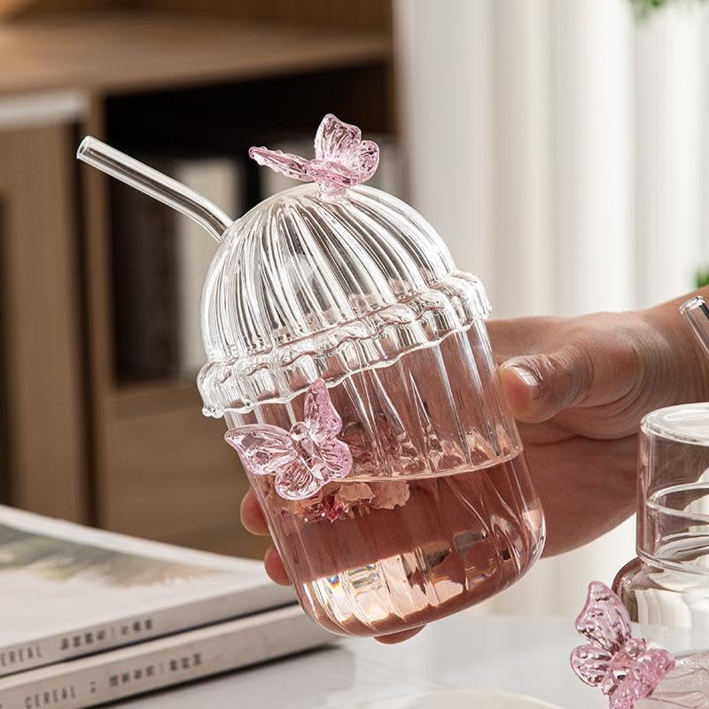 - يحتوي على كوب زجاجي وغطاء وماصة زجاجية مزينة بفراشات وردية ثلاثية الأبعاد تضيف لمسة من الجمال والحنان.
