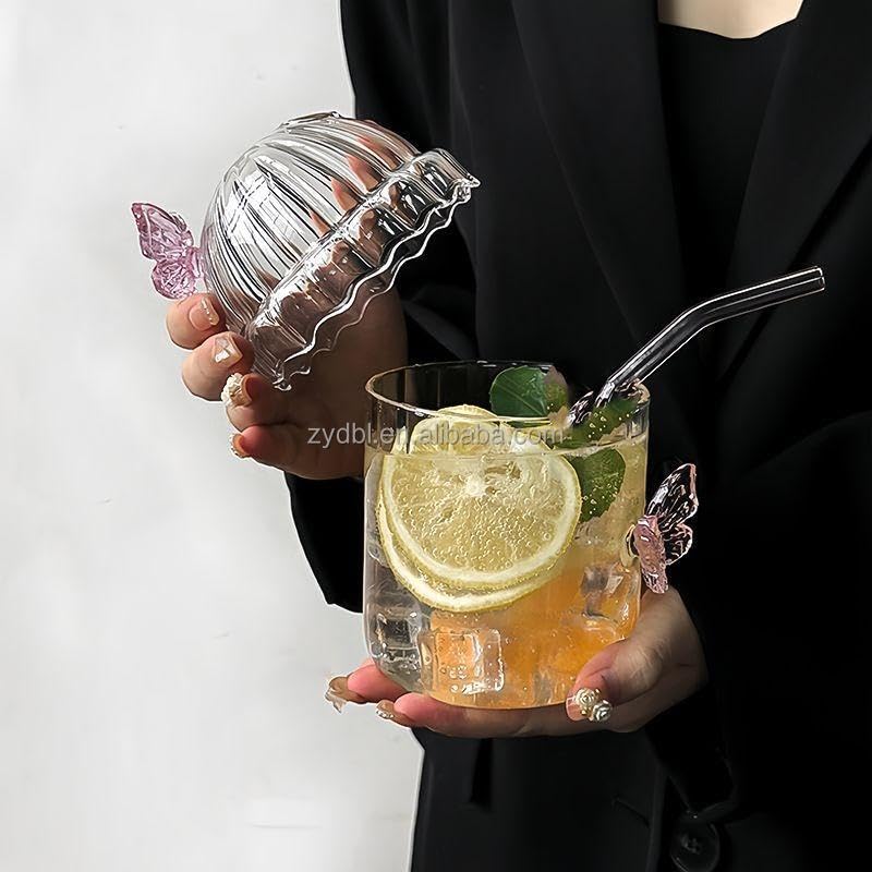 Generic - طقم أكواب بتصميم زجاجي مزين بالفراشات مع غطاء وقشة متناسقة مناسب للمشروبات الباردة والعصائر الطازجة والكوكتيلات الصيفية في الحفلات واللقاءات
