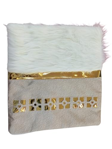 - المواد عالية الجودة: فرو أبيض فاخر مع تفاصيل ذهبية معدنية لامعة تضمن المتانة والأناقة