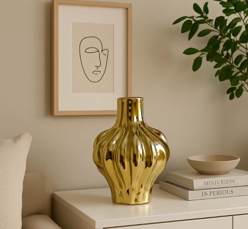 Generic - مزهرية فاخرة للزينة – تصميم متموج منحوت بلمسة نهائية ذهبية لامعة