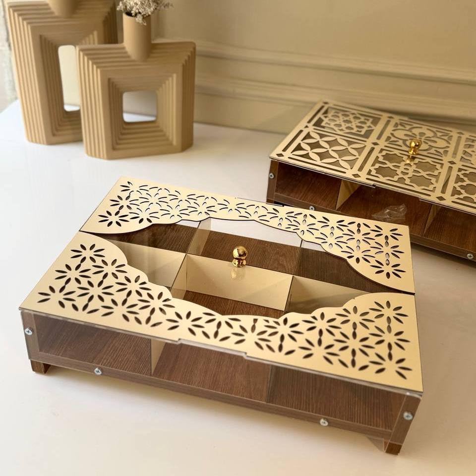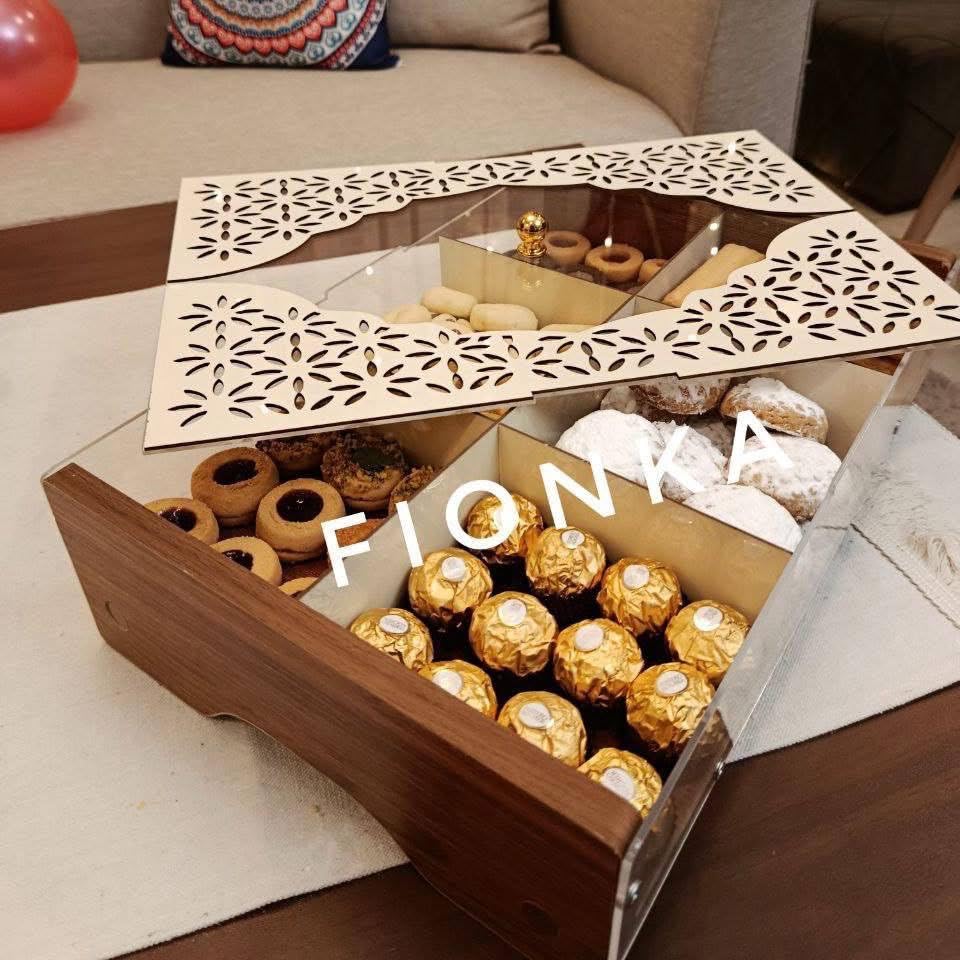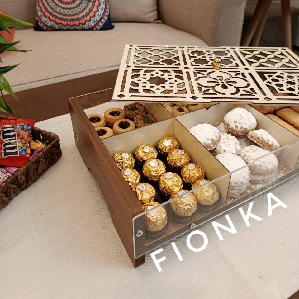 Generic - صندوق تقديم كحك العيد الفاخر مع تصميم محفور وواجهة شفافة، خشب وأكريليك لامع، 26×39 سم، بتقسيمات داخلية منظمة ولمسات ذهبية