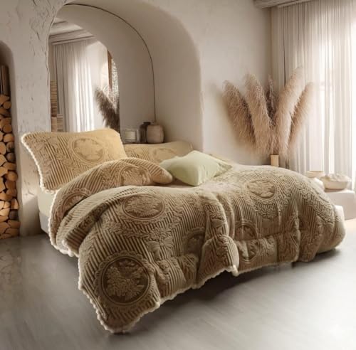 Generic - طقم لحاف فرو فاخر 3 قطع، بيج فاتح كريمي، تصميم هندسي منقوش بارز، فرو صناعي، 240×260 سم، يشمل لحاف و2 غطاء خدادية