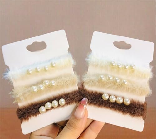 Generic - أستك شعر فاخرة بالفرو والؤلؤ، طقم أستك للزينة بتصميم مزدوج الألوان أبيض وبني، مزينة باللؤلؤ الصناعي