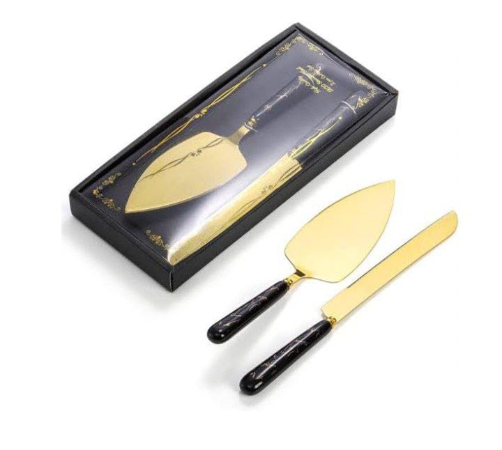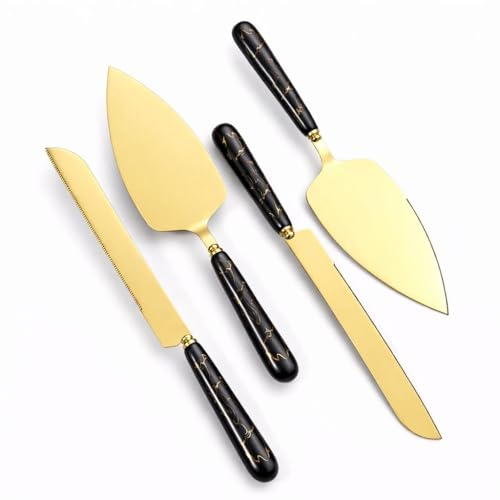 Generic - مجموعة سكين تقديم الكيك الذهبية الفاخرة، شفرة تقطيع حادة بمقابض بنمط رخامي، ادوات تقديم الحلوى الأنيقة للحفلات والاحتفالات والاستخدام المنزلي (لون اسود، قطعتان)