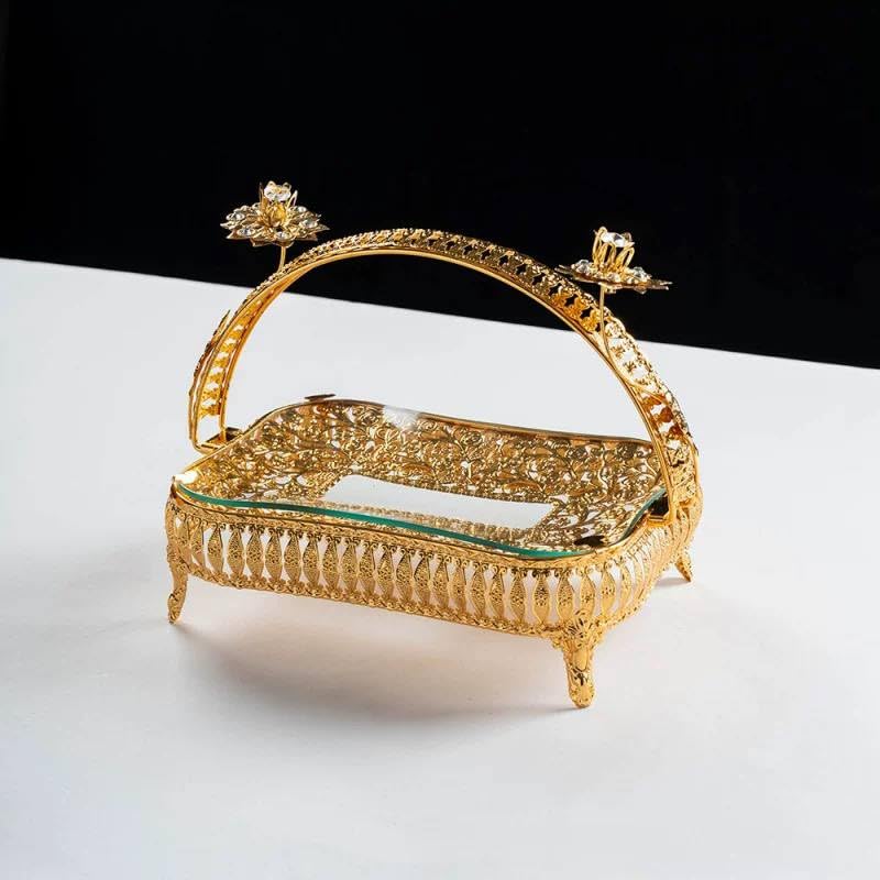 Generic - اطباق للفاكهه فاخر ذهبي، مزخرف بالكريستال، تصميم أنيق مع مقبض علوي، حامل زجاجي للعرض، إطار معدني منقوش مستطيل
