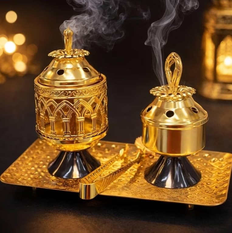 - صينية عرض أنيقة: تتضمن صينية ذهبية معدنية لترتيب المباخر بشكل منظم وجذاب يضيف لمسة جمالية للطاولة أو الرف