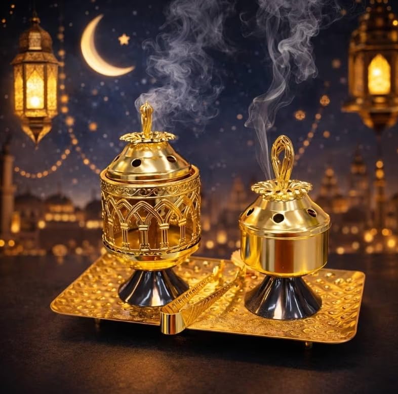 - طقم مبخرة فاخر: يتضمن 4 قطع - مبخرتان بتصميم ذهبي راقي، ماسك فحم، وصينية معدنية لتقديم عرض متكامل وأنيق