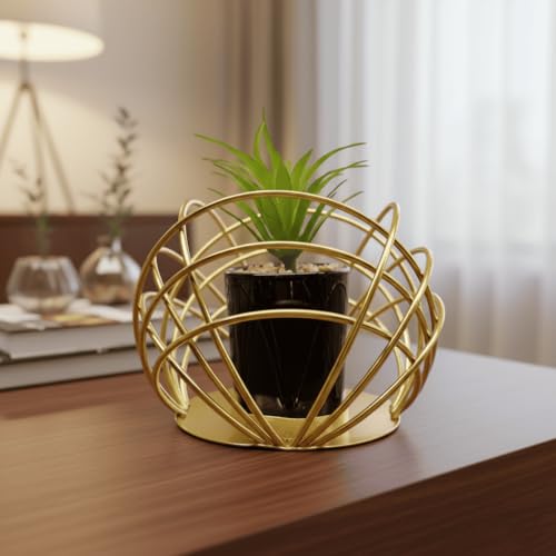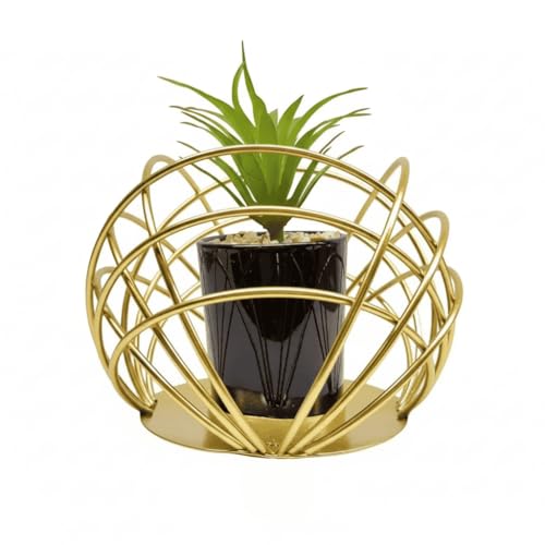 Generic - حامل نباتات معدني ذهبي فاخر، تصميم هندسي دائري، مع وعاء أسود للنباتات الداخلية، ديكور عصري للمنزل والمكتب