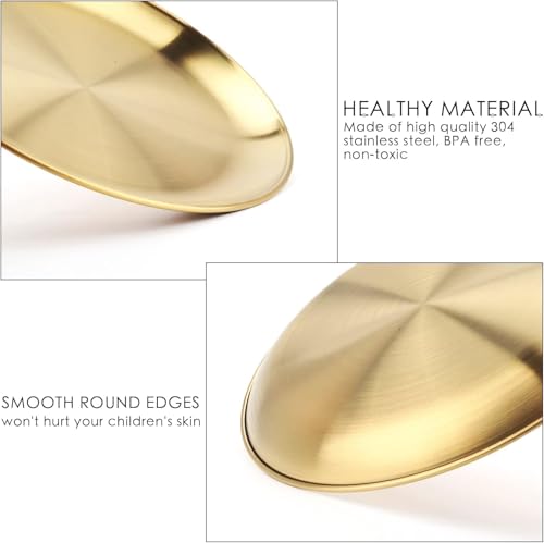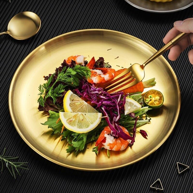 - 🥇 مصنوع من الستانلس ستيل عالي الجودة: الأطباق مصنوعة من فولاذ مقاوم للصدأ يتميز بالصلابة والتحمل، مقاوم للتآكل والبهتان والخدوش، مما يضمن لك استخدامًا طويل الأمد دون أن يفقد بريقه الذهبي الفاخر.