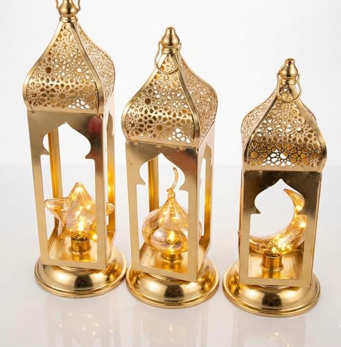 - تصميم عصري فاخر: طقم مكون من 3 فوانيس معدنية بطلاء ذهبي عالي الجودة وتفريغات زخرفية إسلامية دقيقة، تضفي لمسة من الفخامة والرقي على ديكور منزلك.