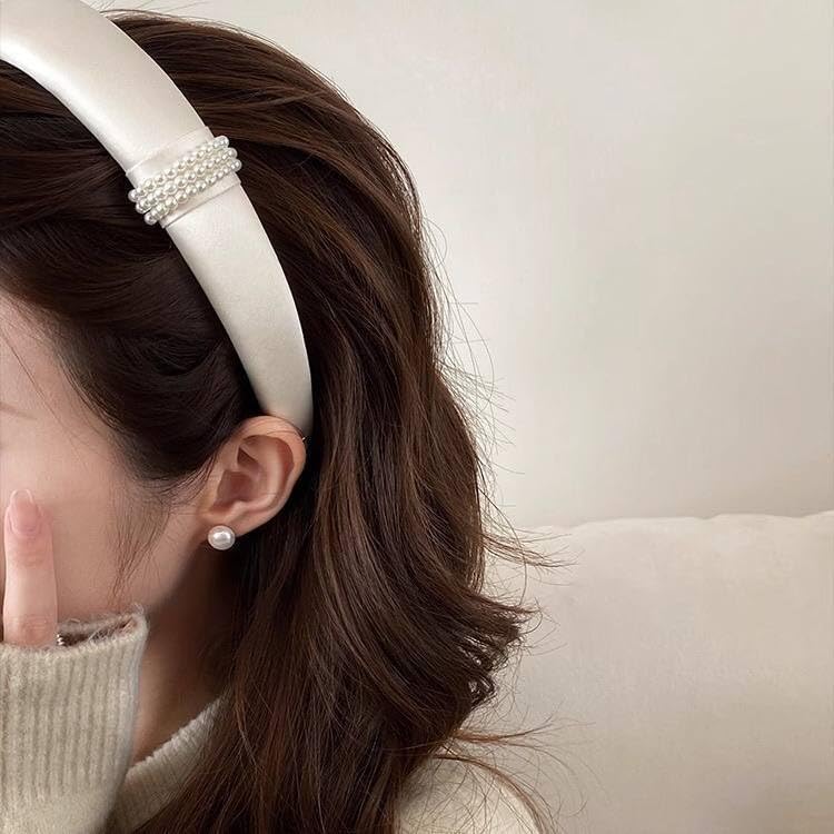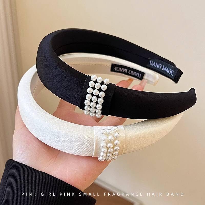 Generic - رباط رأس مبطن مصنوع يدويًا من الساتان العريض للنساء يتميز بتصميم أنيق ومزين باللؤلؤ ومناسب للارتداء اليومي والحفلات، قطعة واحدة، مقاس واحد، لون أبيض