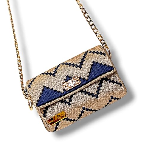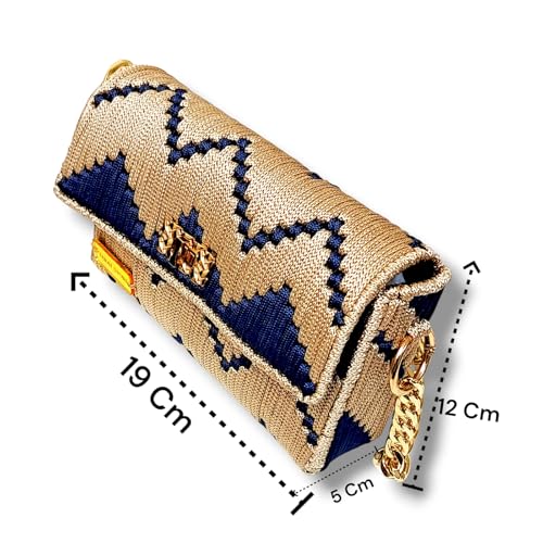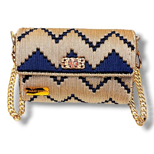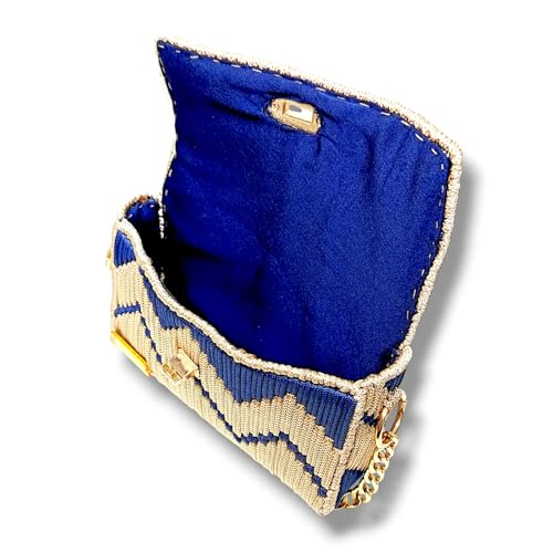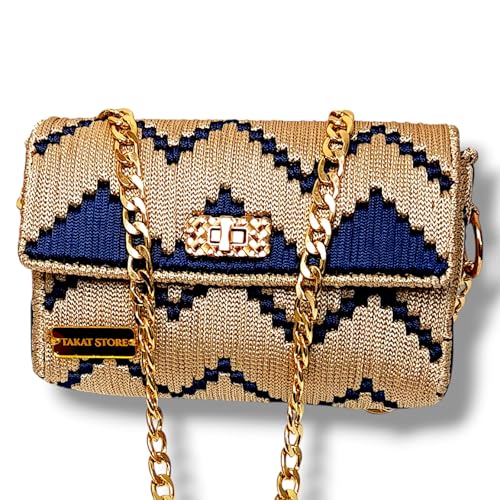 عام - شنطة كلاتش يد حريمي هاند ميد فاخرة - خيط سلسلة منسوج ذهبي وكُحلي - نقشة شيفرون (Zigzag) - قفل معدني ذهبي - شنطة سهرة ومناسبات