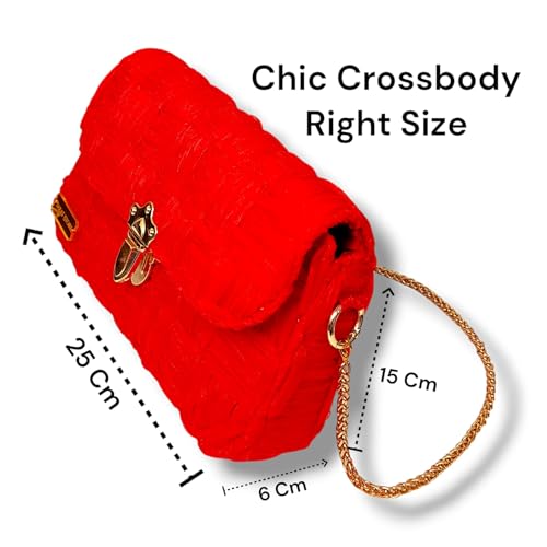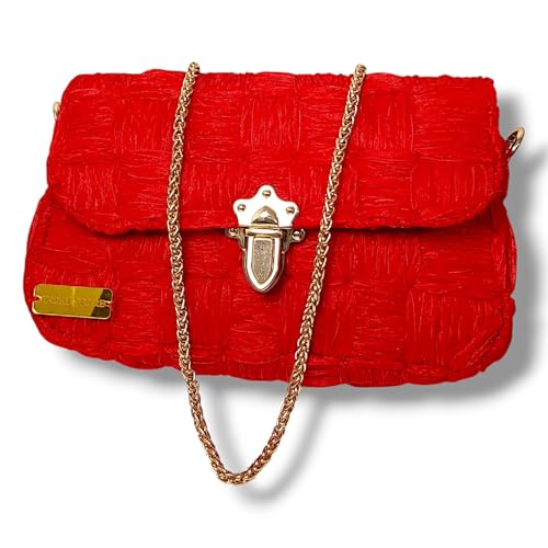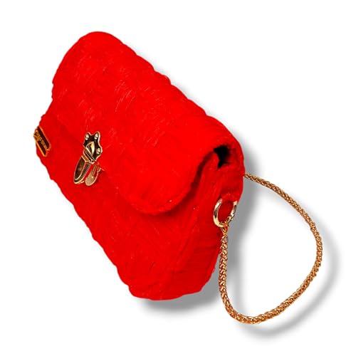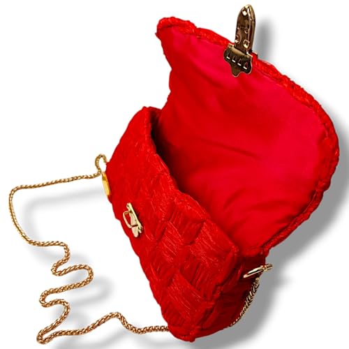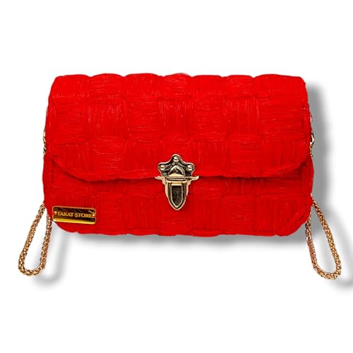 عام - شنطة كروس حريمي هاند ميد فاخرة - خيط أورجانزا أحمر - قفل معدني ذهبي - سلسلة كتف 100 سم - شنطة نسائية موضة