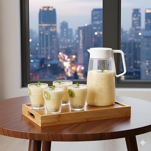 - يسمح فم الإبريق الواسع بالصب السهل دون انسكاب، بينما توفر الأكواب الزجاجية المتينة قبضة مريحة.