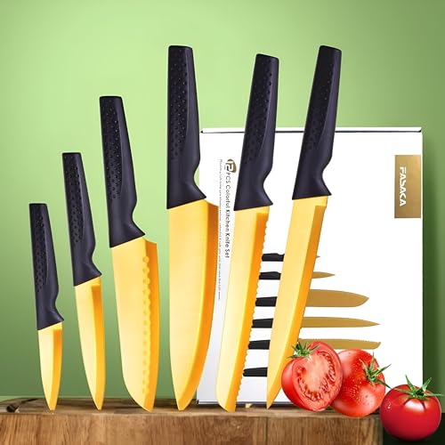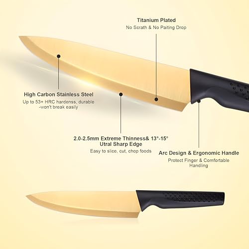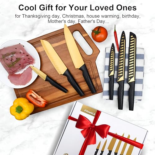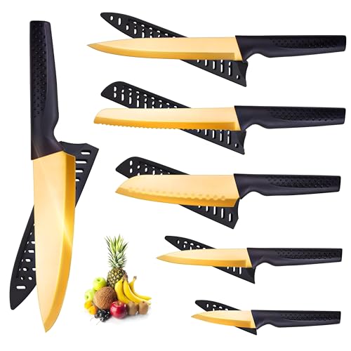 Generic - مجموعة سكاكين فاخرة - طقم سكاكين مطبخ من الفولاذ المقاوم للصدأ بمقبض غير قابل للانزلاق وشفرات بلمسة ذهبية مع غطاء حماية وصندوق هدايا أنيق - مثالية للطهاة والهدايا الجديدة، مجموعة من 6 قطع