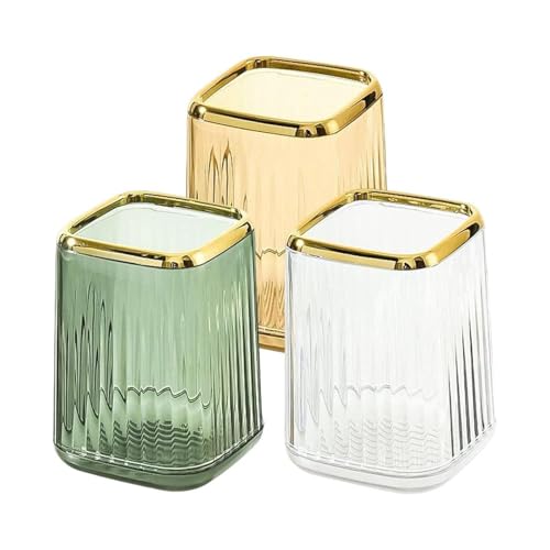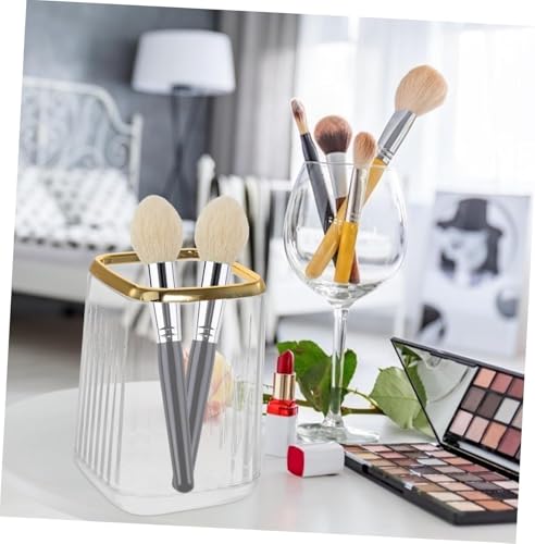 - تصميم أنيق: حامل فرش مكياج زجاجي فاخر بتصميم خطوط عمودية وحافة مزينة باللون الذهبي الفاخر، يضفي لمسة من الأناقة على أي منضدة زينة أو سطح حمام.