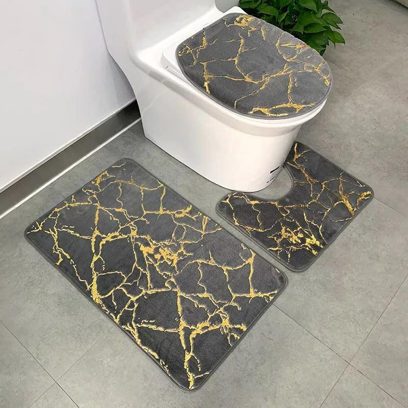 Generic - طقم سجاد حمام فاخر بنقشة الرخام ، مكون من دواسة على شكل حرف U، ومشاية، وغطاء قاعدة الحمام (رمادي)