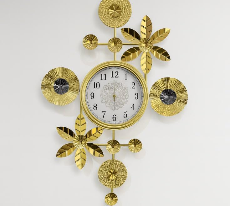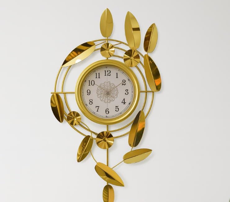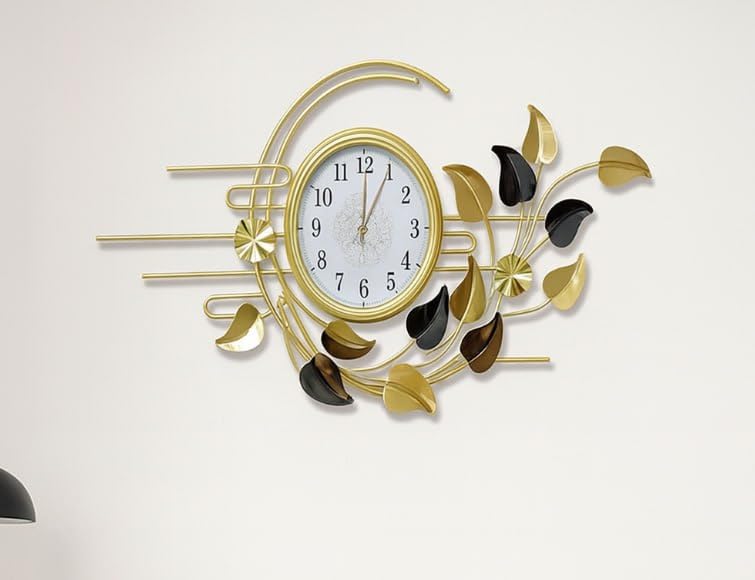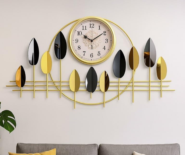 • تصميم فني: ساعة حائط معدنية مع أوراق ذهبية وسوداء متناسقة تضيف لمسة عصرية وأنيقة لديكور منزلك