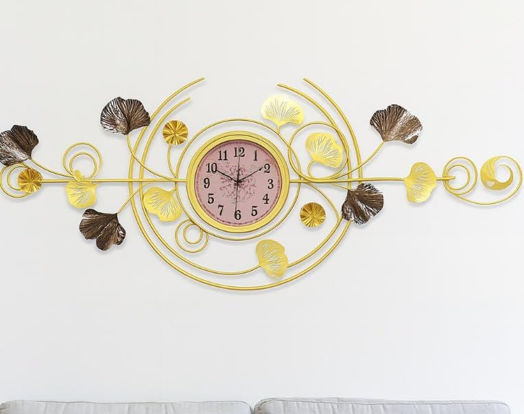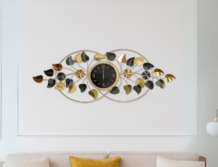 Generic - ساعة حائط ديكور معدنية فاخرة، تصميم فني بأوراق ذهبية وسوداء، ديكور منزلي عصري