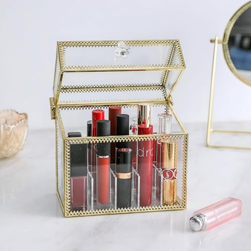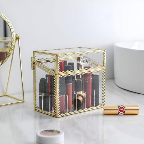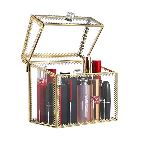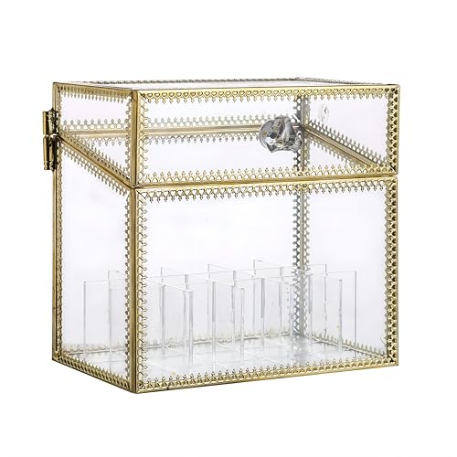 - يتميز منظم المكياج والمجوهرات هذا بسطح زجاجي شفاف أنيق مقترن بحواف معدنية ذهبية، مما يخلق مظهرًا أنيقًا وفاخرًا يكمل أي نمط ديكور مع تنظيم الإكسسوارات أو المجوهرات أو مستحضرات التجميل بكفاءة.