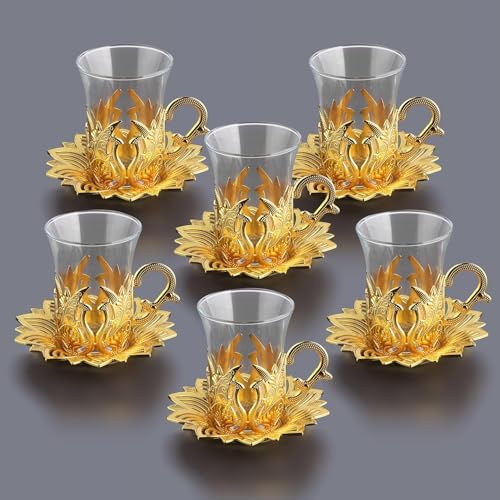 - مجموعة فاخرة: طقم شاي تركي تقليدي كامل مكون من 6 قطع يتميز بأكواب زجاجية أنيقة موجودة في حوامل معدنية مزخرفة بلون ذهبي مع أطباق مطابقة
