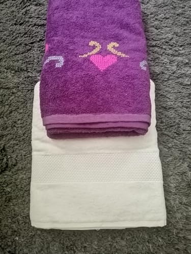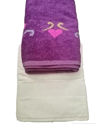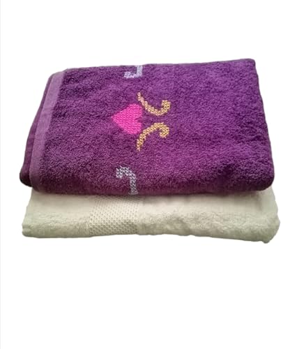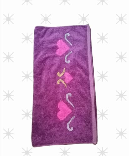 Generic - منشفة حمام فاخرة بنفسجية، مع تطريز يدوي قلوب وردية مقاس كبير 70 * 140سم+ فوطه جراي مقاس 50 * 100 سم قطن ناعم، للحمام والمنزل _ مجموعه من قطعتين