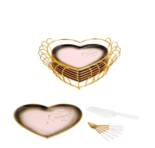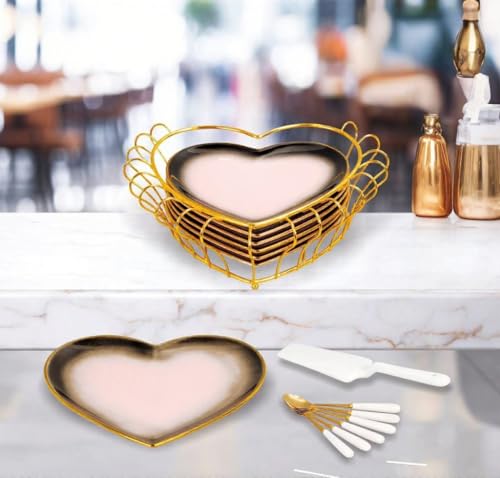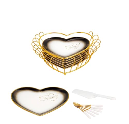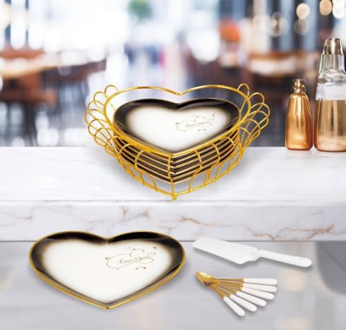 - [عدد القطع ومكونات الطقم]: الطقم يحتوي على 15 قطعة تشمل طبق تقديم كبير 25 سم، 6 أطباق صغيرة، 6 ملاعق، ماسك تقديم، وحامل جولد للأطباق. هذا التنوع يجعل الطقم عمليًا لتقديم الحلويات والجاتوه بطريقة منظمة وجذابة، مع تسهيل الاستخدام اليومي أو في المناسبات الخاصة.