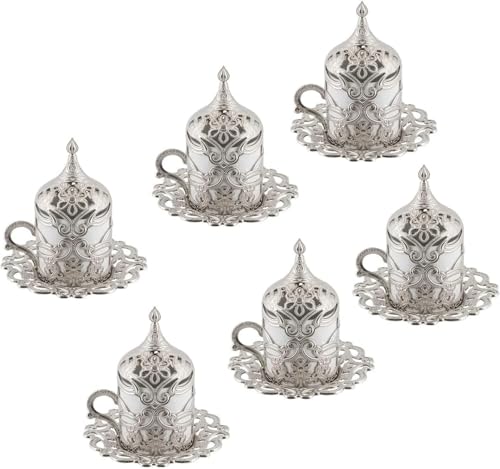 Generic - مجموعة قهوة تركية، بتصميم زهور فضية مع 6 أكواب وأطباق فناجين وأغطية وحوامل، مجموعة تقديم إسبريسو عربية تقليدية 60 ملليلتر، 24 قطعة